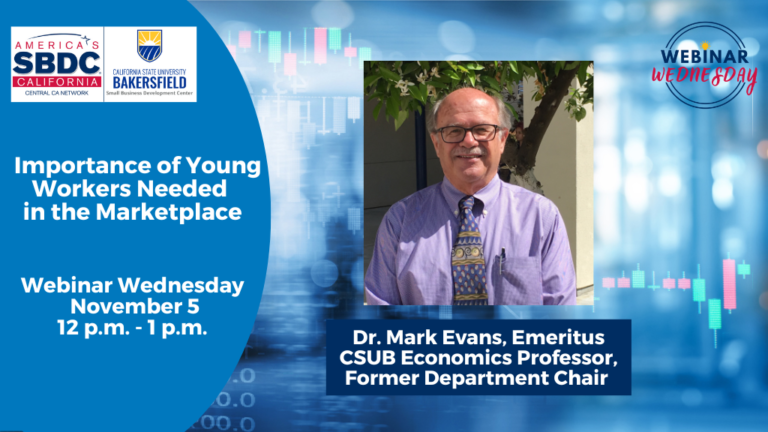 On this week’s free webinar, host and SBDC director, Kelly Bearden will be joined by economist Mark Evans, emeritus professor from CSUB. Dr. Evans will focus on the growing importance of young workers needed in the marketplace, strategies small businesses can use to recruit them, and public policies to increase the pool of capable young workers 16 to 22 years of age.