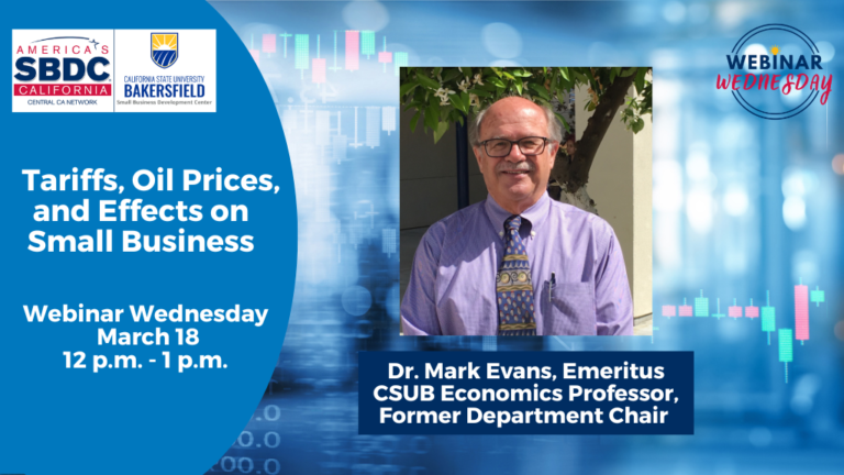 On this week’s free webinar, host and SBDC director, Kelly Bearden will be joined by economist Mark Evans, emeritus professor from CSUB. Dr. Evans will give an economic update that includes effects of tariff fees on small businesses, steps to maximize a potential tariff refund, and likely oil price and macroeconomic outcomes for several Iran scenarios.